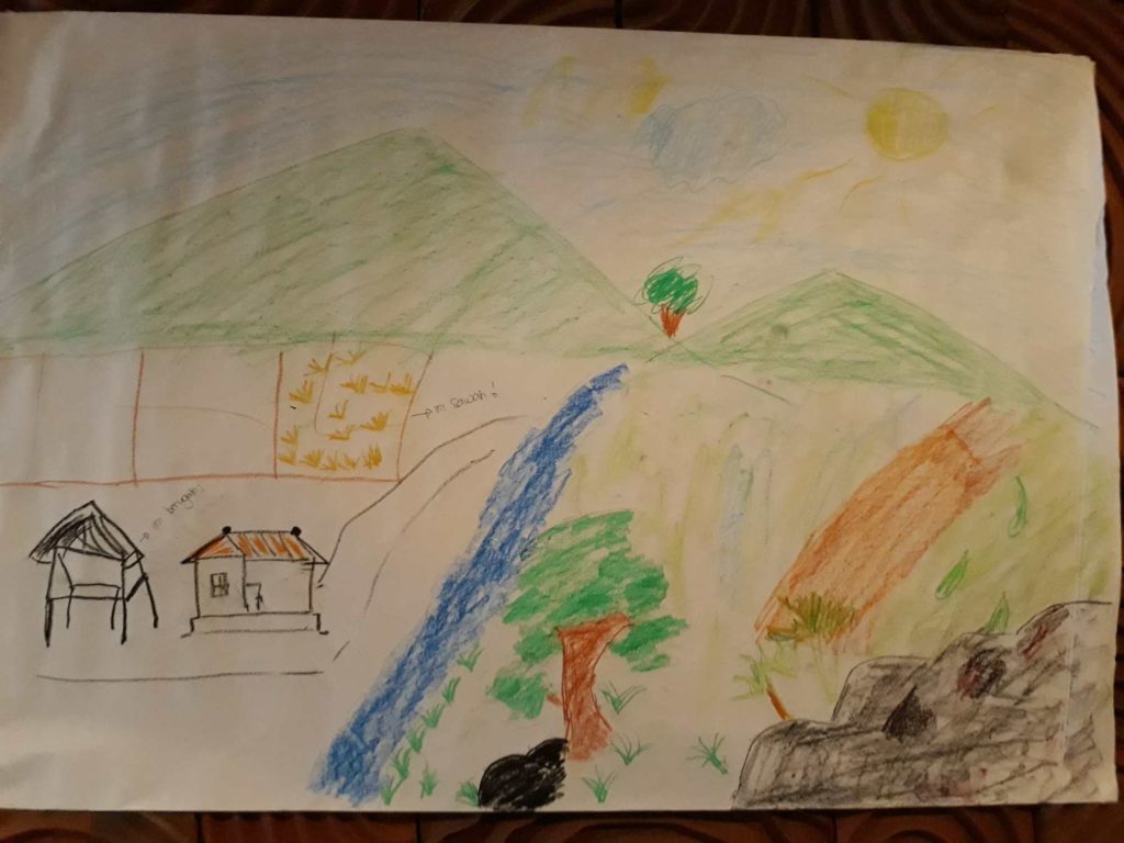 This drawing expresses Jamhur’s and West Lombok Citizens’ hope to have a beautiful and sustainable environment like they did before the mining industries came. Foto: PWYP Indonesia, 2019