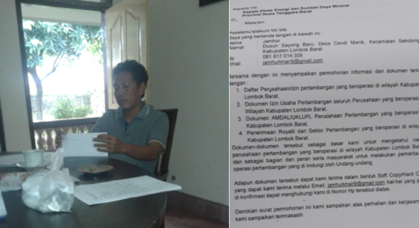 After knowing and understanding his rights, Jamhur, representing Sekotong citizens, submitted requests related to mining permits documents in West Lombok Regency to One-Stop Integrated Investment and Services Office and to the provincial Energy and Mineral Resources Office.
