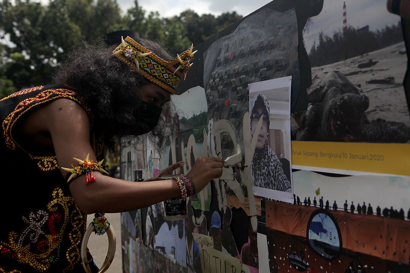 Activists from the Clean Up Indonesia coalition stage a theatrical act as a part of a greater effort to amend the 2020 mining law in Jakarta, Indonesia. Image courtesy of Melvinas Priananda/Bersihkan Indonesia.