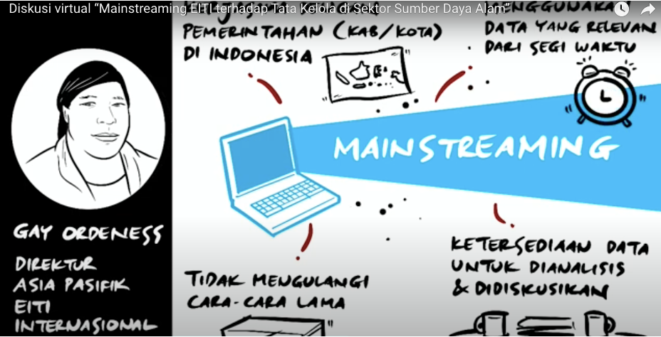 Gay Ordeness, Asia Pacific Director of EITI International, said EITI mainstreaming is how extractive industry data that has been reported and published through EITI reports in the future can be developed and integrated through data transparency systems in companies and governments by adding the relevance of the data. In addition, the discussion of mainstreaming is carried out in stages by the Multi-Stakeholder Group (MSG).