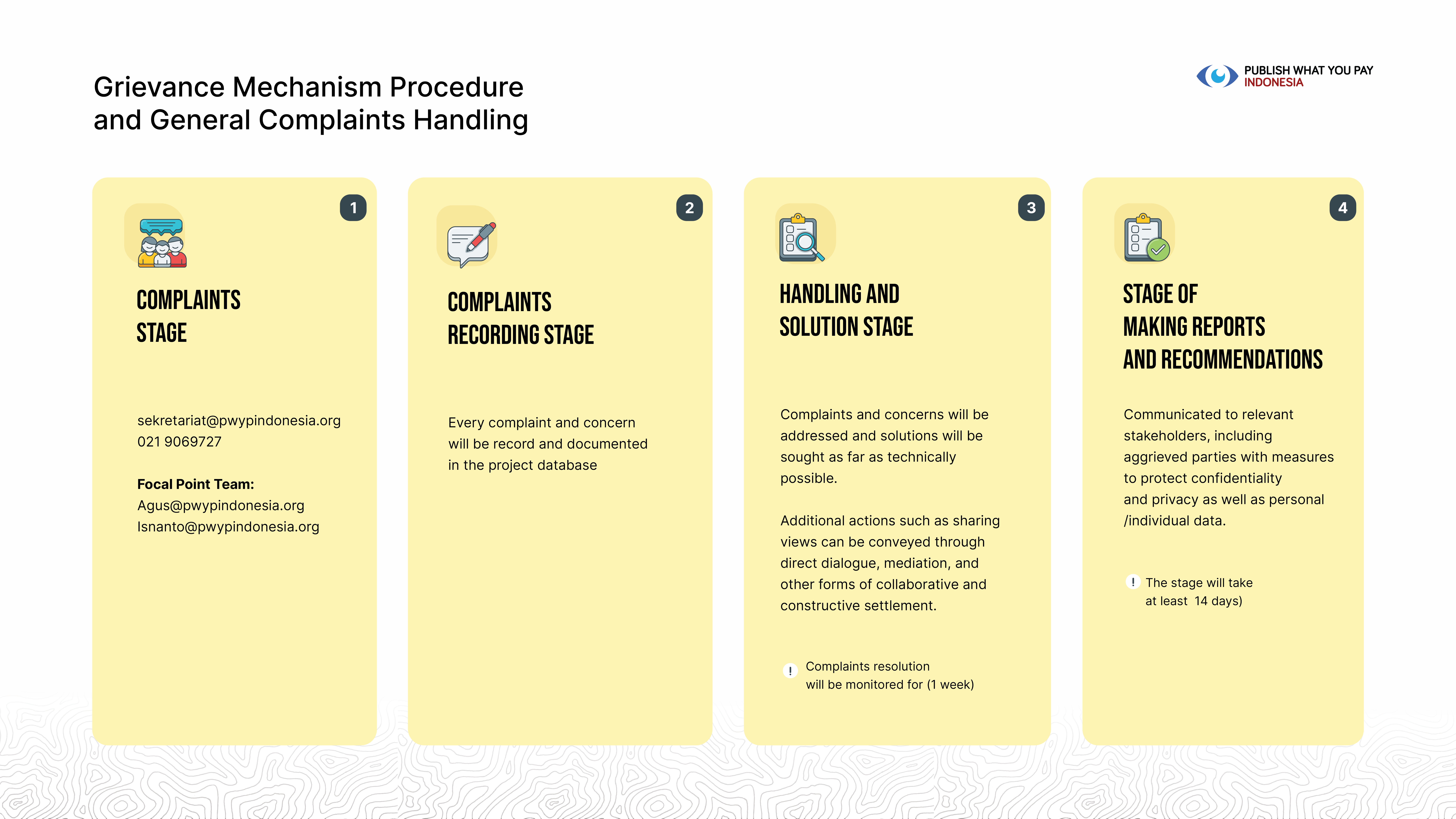 Grievance and feedback mechanism in the GPSA Program PWYP Indonesia is a system and resource that is formed by GPSA Program and is intended to address things regarding implementation of the program and potential impact from a policy, program and implementation that is implemented by external stakeholders through GPSA Program. In this case, the implementation of the program in particular is the effort to enforce and comply with the social and environmental safeguards formed and compiled by the focal point team together with the national secretariat of PWYP Indonesia.