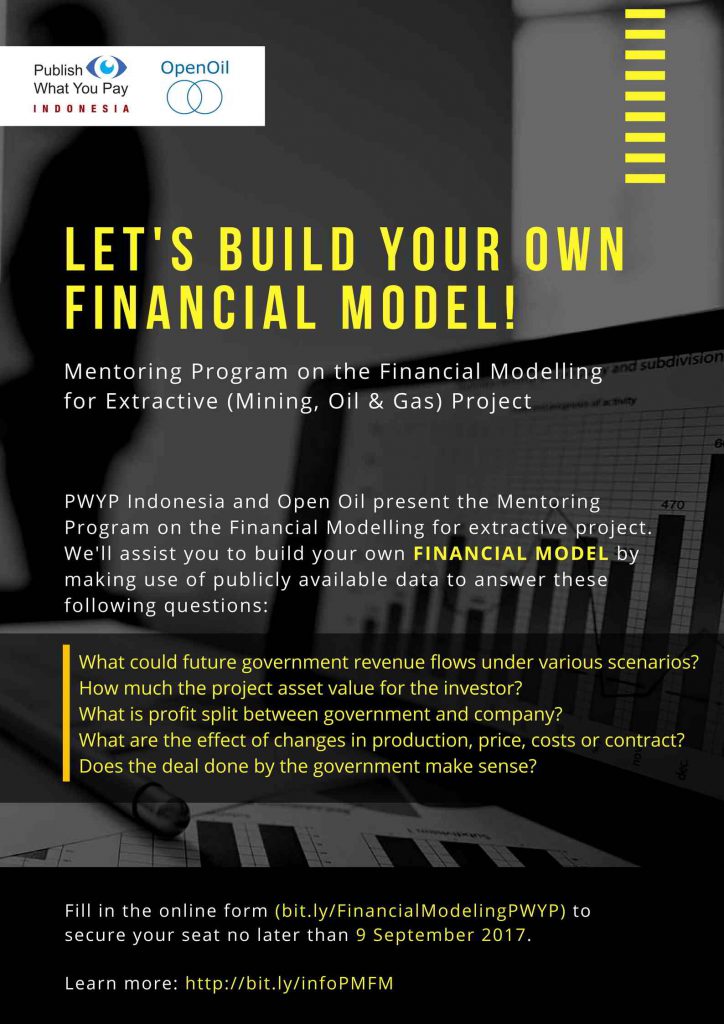 Publish What You Pay (PWYP) Indonesia is civil society coalition focusing on the transparency and accountability of extractive resource governance, covering oil and gas, mineral and coal, as well as other natural resources. PWYP Indonesia collaborating with Open Oil, Berlin based consultancy specialized on open data and natural resources will conduct mentoring program on the financial modelling in the extractive industries.