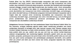 Publish What You Pay (PWYP) Indonesia-koalisi masyarakat sipil untuk transparansi dan akuntabilitas tata kelola sumber daya ekstraktif, memiliki visi bagi terwujudnya tata kelola sumber daya ekstraktif di Indonesia yang transparan, akuntabel dan berpihak pada kepentingan nasional sehingga menjadi modal bagi kesejahteraan dan keadilan sosial. Untuk mewujudkan visi tersebut, PWYP memiliki misi dalam (1) mengembangkan kampanye nasional dan lokal untuk akuntabilitas dan transparansi tata kelola sumberdaya ekstraktif migas, pertambangan, dan sektor ekstraktif lainnya; (2) Melakukan penguatan kelompok-kelompok masyarakat sipil di tingkat lokal dan nasional untuk mendorong akuntabilitas dan transparansi tata kelola sumberdaya ekstraktif migas, pertambangan dan sektor ekstraktif lainnya; serta (3) Mengawal proses pembentukan dan pelaksanaan peraturan perundangan yang terkait dengan transparansi dan akuntabilitas sumberdaya ektraktif.