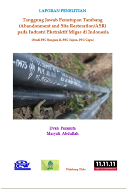This is a research report conducted by Dyah Paramita and Maryati Abdullah in 2010 regarding the Responsibility of Mine Closure (Abandonment and Site Restoration / ASR) in the Oil and Gas Extractive Industries in Indonesia, for studies in the Bengara II PSC, Yapen PSC, and Cepu PSC. This research was conducted by the Indonesia Corruption Watch (ICW) in collaboration with the Indonesian Center for Environmental Law (ICEL) with the support of Vecht Mee Tegen Onrecht (11.11.11).