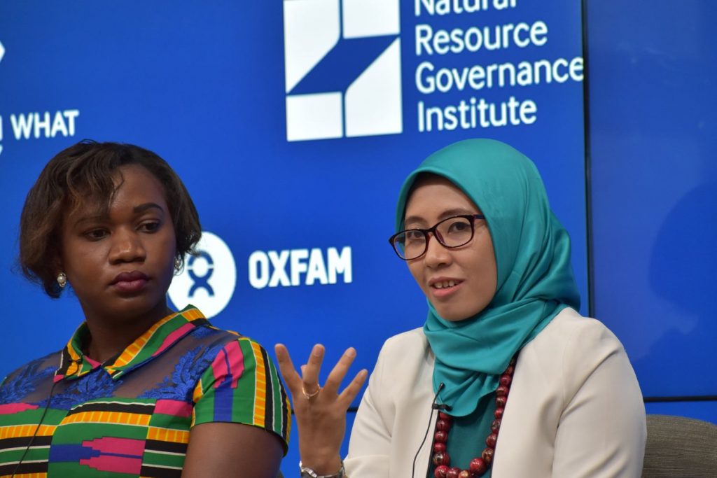 The first panel in this public event including Elyvin Nkhonjera, Program Coordinator of Extractive Industries, Oxfam in Malawi; Barnaby Pace, Campaigner of Global Witness; Maryati Abdullah, National Coordinator of Publish What You Pay Indonesia; and Don Hubert, President of Resource for Development Consulting. The panels hosted by Isabel Munilla, Policy Lead of Extractive Industries, Oxfam America.