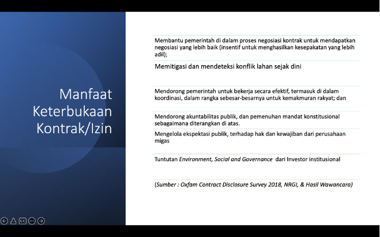 Giri also explained some benefits of encouraging the disclosure of contract and permit documents. The benefits of this disclosure initiative can be divided into three beneficiary actors: the government, business actors, and the community. For the government this disclosure initiative can help the government in the contract negotiation process to get better negotiations, improve the investment climate, and encourage government accountability in realizing good governance. For businesses, the Environment, Social, and Governance demands from investors also manage public expectations of the rights and obligations of companies and communities, mitigating and detecting conflicts early on and knowing the rights and obligations of industrial activities that will take place.