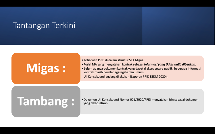 In terms of current challenges in encouraging this initiative, Giri divides it into the oil and gas (oil gas) and mining sectors. In the oil and gas sector, there is no Information Documentation and Management Officer (PPID) in the SKK Migas structure. As well as the absence of publicly accessible contract documents, the Supreme Court (MA) declared oil and gas contracts as information that is not required to be provided. As for the mining sector, contract documents and licenses are included in exempt input based on Consequence Test No. 001/2020/PPID.