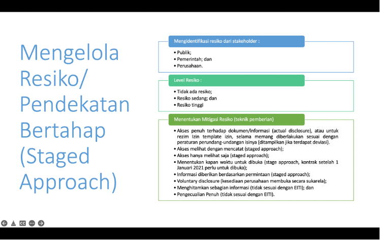 According to Giri, several steps must be taken by Indonesia to implement the mandate, which is of particular concern to stakeholders first, whether the laws and regulations in Indonesia allow the disclosure of contract and license documents. Second, about the risks, especially from the government side, whether there will be risks caused by opening contract and permit documents, and how to mitigate these risks.