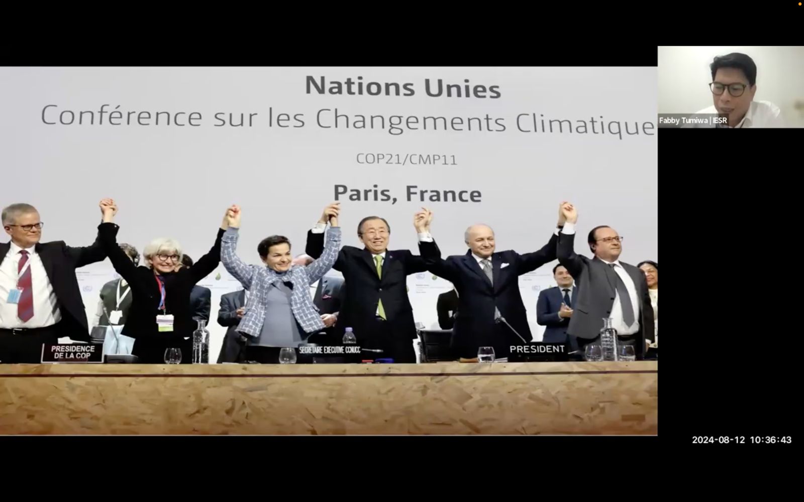 Fabby outlined the history of global efforts to tackle climate change, starting with the ratification of the UNFCCC (United Nations Framework Convention on Climate Change) and the first COP (Conference of the Parties) in Berlin in 1995. Under the Kyoto Protocol agreement, countries were required to reduce their emissions, though political dynamics led some countries, like the United States, to withdraw from the protocol.