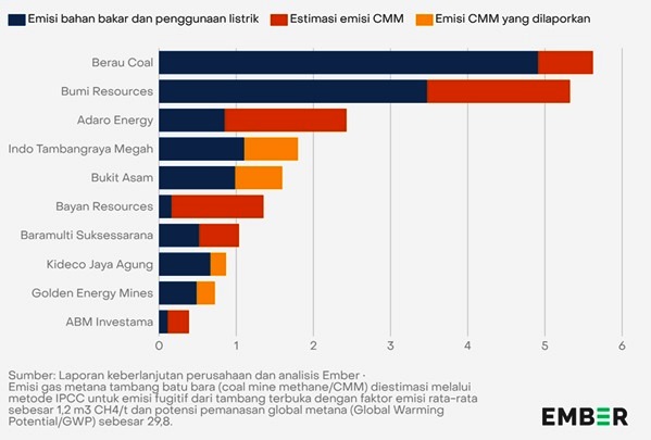Secara keseluruhan, EMBER memperkirakan emisi CMM dari 10 perusahaan batubara terbesar di Indonesia bisa melebihi 8 juta ton CO2e. Angka ini sepertiga lebih dari total potensi emisi perusahaan-perusahaan tersebut. Padahal, ke-10 perusahaan tersebut berkontribusi terhadap setengah dari total produksi batubara Indonesia.