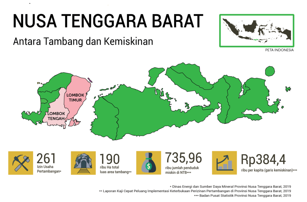 Aktivitas pertambangan, baik tambang logam dan non-logam cukup marak di Provinsi Nusa Tenggara, termasuk penambangan pasir besi dan pasir laut di pesisir pantai di Kabupaten Lombok Timur dan Lombok Tengah. Sayangnya, potensi pertambangan ini belum berhasil meningkatkan kualitas hidup warga. Kerusakan lingkungan yang ditimbulkan justru menjadikan warga sekitar tambang sebagai pihak yang paling dirugikan.