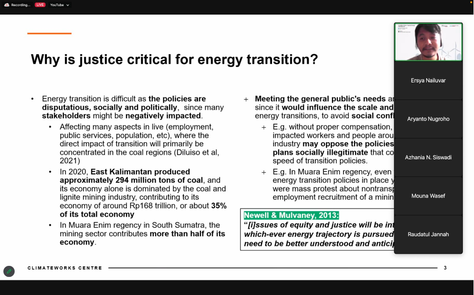 Sebagai pembukaan dalam pemaparannya, Fikri menyajikan gagasan pentingnya keadilan dalam transisi energi dikarenakan tantangan yang kompleks dari dinamikanya dalam konteks ekonomi, sosial, dan politik di Indonesia. Misalnya, produksi batubara di Kalimantan Timur berkontribusi pada ekonomi mereka sebesar 35%, atau di Muara Enim, Sumatera Selatan, sektor pertambangan berkontribusi lebih dari setengah persen ekonomi mereka. Oleh karena itu, penting bagi masyarakat terdampak untuk mendapatkan kompensasi yang memenuhi kebutuhan mereka ketika dilakukan transisi energi.