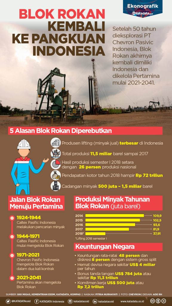 Menteri BUMN Erick Thohir menyambut kembalinya Blok Rokan ke pangkuan Indonesia, setelah nyaris satu abad lamanya dieksplorasi dan dieksploitasi oleh perusahaan migas asal Amerika Serikat (AS), Chevron Pacific Indonesia (CPI).