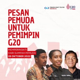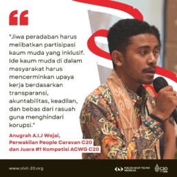 Pemuda-pemudi “jaman now” pun juga bersemangat dalam menyampaikan aspirasi membangun bangsa. Mereka punya pesan untuk para pemimpin G20 untuk serius menangani dan memperbaiki tata kelola SDA, akselerasi energi bersih, serta berupaya sebaik-baiknya dalam memberantas korupsi.