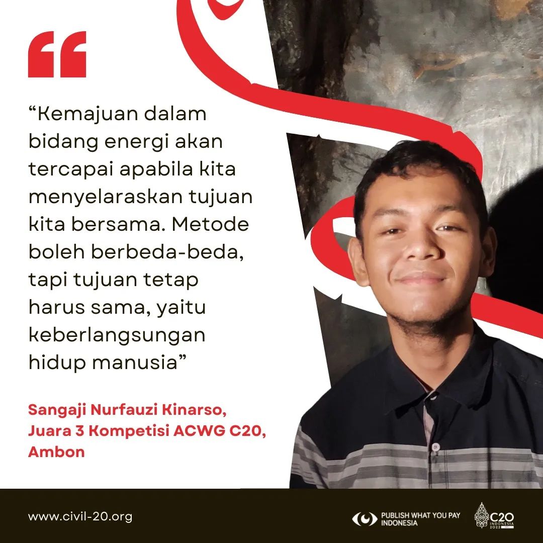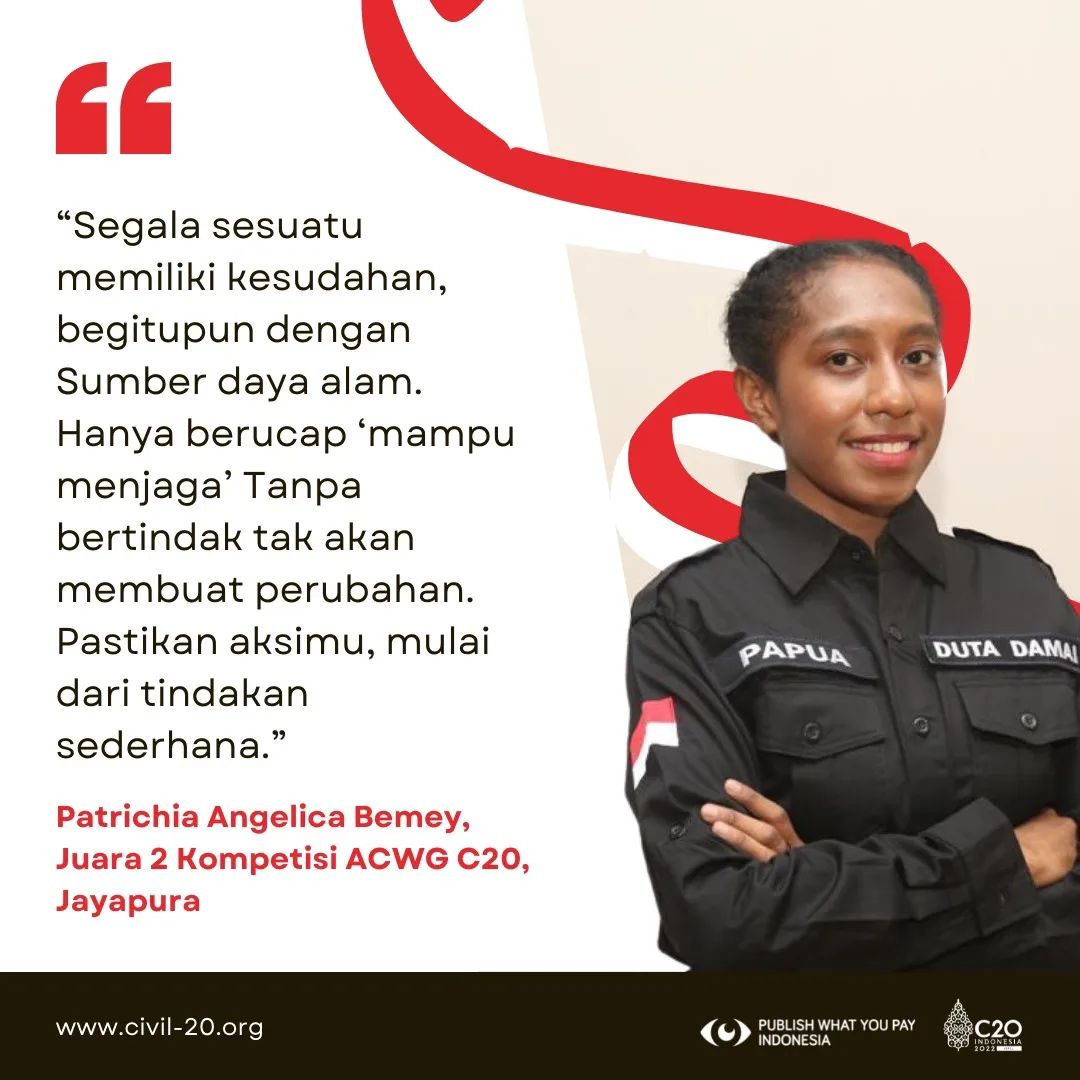 Pemuda-pemudi “jaman now” pun juga bersemangat dalam menyampaikan aspirasi membangun bangsa. Mereka punya pesan untuk para pemimpin G20 untuk serius menangani dan memperbaiki tata kelola SDA, akselerasi energi bersih, serta berupaya sebaik-baiknya dalam memberantas korupsi.