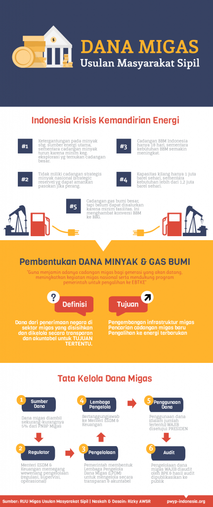 Dana migas ini ditujukan guna menjadi jaminan adanya cadangan migas bagi generasi mendatang, meningkatkan kegiatan migas nasional, serta mendukung program pemerintah untuk beralih ke EBTKE. Berikut adalah infografis Dana Migas Usulan Masyarakat Sipil: