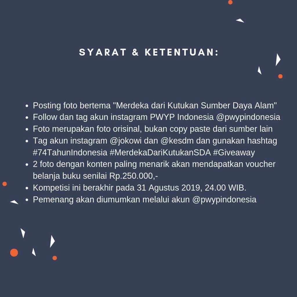 Dalam memeriahkan #74thindonesia, PWYP Indonesia adakan giveaway nih guys! Caranya gampang banget, posting foto karyamu dengan tema “Merdeka dari Kutukan Sumber Daya Alam”.