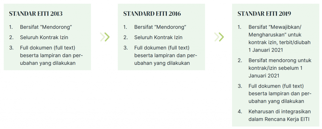 Seperti yang sudah dijelaskan sebelumnya, bahwa Indonesia memiliki komitmen di dunia internasional untuk melakukan keterbukaan kontrak. Komitmen tersebut adalah terkait dengan keanggotaan Indonesia dalam EITI, yang merupakan inisiatif global mengenai transparansi di sektor industri ekstraktif. Dalam standar EITI, keterbukaan kontrak sudah dimulai sejak 2013, tetapi masih bersifat anjuran (encourage). Pun begitu dengan standar EITI 2016. Namun demikian, dalam standar EITI 2019, keterbukaan kontrak menjadi keharusan bagi seluruh negara anggota, termasuk Indonesia.